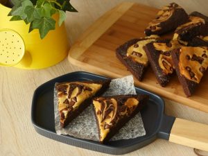 In 8 x 8 inch baking pan lined with butter paper,add prepared brownie batter and cream cheese batter and make swirls with the help of the skewer.