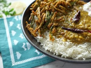 -In a serving bowl,add boiled rice,prepared daal,crispy bhindi,kachumar raita,achar & serve!