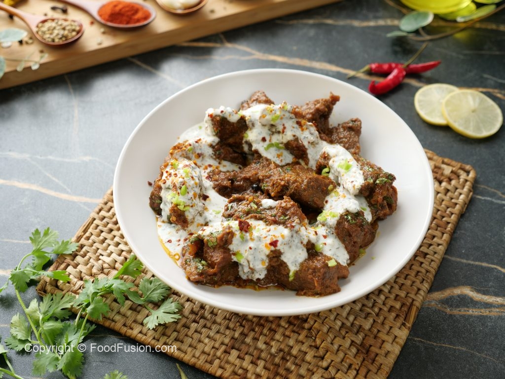 Drizzle prepared yogurt sauce on smokey dahi beef masala,sprinkle green chilli,red chilli crushed & serve with naan!