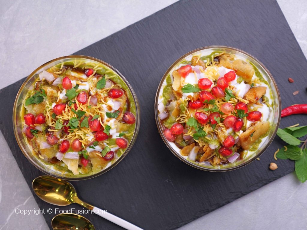 -In a serving bowl or cup, add crushed papri, prepared potato mixture, whisked yogurt, prepared green chutney, sweet tamarind chutney, crushed papri, onion.