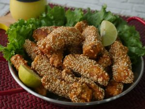 Add egg,all-purpose flour,cornflour,chicken powder,sesame seeds,vinegar & mix well.