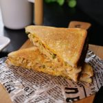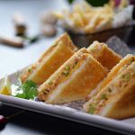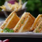 -Heat cast iron frying pan,place sandwich (upside down),apply melted butter on another side & grill from both sides until golden & crispy (makes 6).