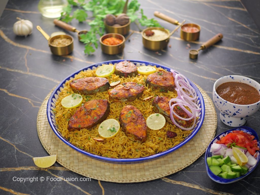 -Serving platter mein mandi rice dalein, upar baked fish rakh den.