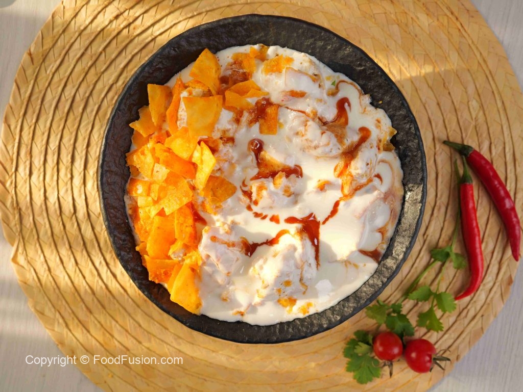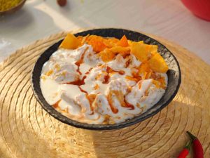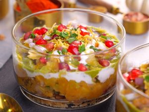 -In a bowl, add prepared dahi bhallay break them with spoon, sprinkle Dahi bada masala, papri, pour creamy meethi dahi, prepared imli chutney & serve!