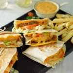 -On a tortilla wrap,place two cheddar cheese slices,beef patty on one cheese slice,iceberg,tomato, prepared burger sauce on beef patty & fold sides to make a wrap.