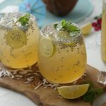 In a serving glass,add crushed ice,lemon slices,soaked basil seeds,prepared coconut nut iced tea & serve!