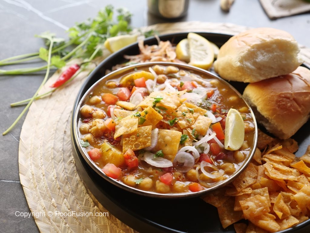 -Serving plate mein khathiawari choley,tayyar hari chutney,tamatar,chaat masala,lal mirch crushed, pyaz,papri aur hara dhania dal dein aur pav buns ka saath serve karein!