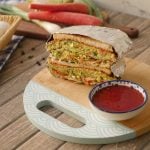 Vegetable & egg omelet per reserved vegetables,chicken salami dal ker toasted bread slice rakh dein phir flip ker ka bareek cheeni aur tomato ketchup dal dein aur top per remaining bread slice rakh dein.