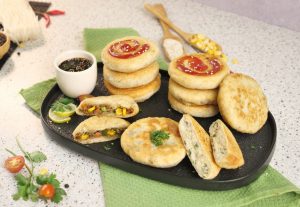 -Veg filling or cheese filling ko dough ka center mein dal dein aur tamam sides ko gather ker ka pinch & seal ker lein.