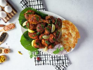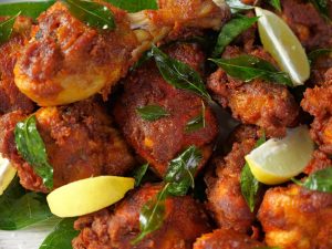 -Karahi mein cooking oil (140°C) garam karein aur marinated chicken ko halki ancch per golden & crispy