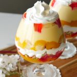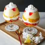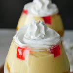 In serving cup,add mango puree,red jelly cubes,pistachios & almonds,whipped cream,plain cake cubes,mango puree,prepared custard,red jelly cubes and garnish with whipped cream.