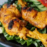 In frying pan,add marinated chicken pieces (reserve marinade for later use),water,cover & steam cook on low flame until tender (18-20 minutes) and turn sides in between.