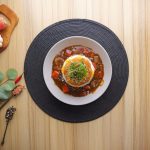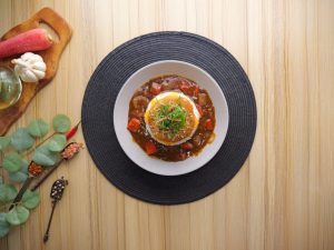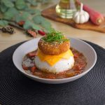-In a serving platter, add boiled rice, prepared sauce, cheese slice, prepared menchi katsu, & garnish with spring onion, sesame seeds then serve!