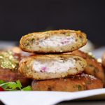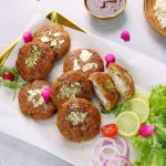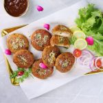 -Grease hands with oil,take small quantity of mixture (80g) & flatten on your palm,add ½ tbs of prepared yogurt filling,cover properly & make kabab of equal sizes (makes 10-11).