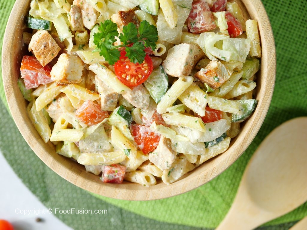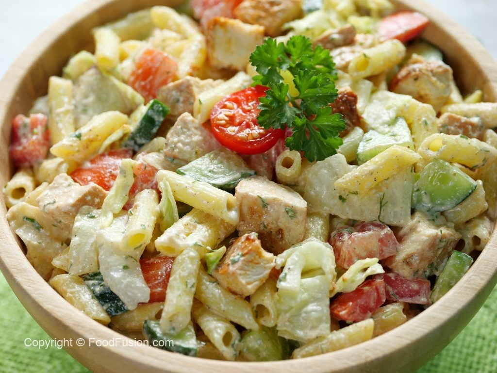 -Bowl mein penne pasta,grilled chicken,kheera,tamatar aur iceberg dal ker ache tarhan toss ker lein.