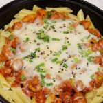 In a cast iron pan,add penne pasta,cooked chicken,mozzarella cheese,spring onion leaves,black & white sesame seeds,cover & cook on low flame until cheese melts (4-5 minutes).