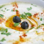 Now dish out hummus, make well with a spoon and drizzle olive oil and paprika. Add 1-2 black or green olive for garnish.