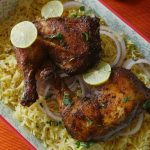 Chicken ko saffron rice,onion rings,dahi ka raita aur chutney ka saath serve karein.