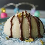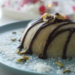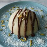 Add a scoop of king kulfa and cover with semolina halwa then flip on serving plate and garnish with desiccated coconut,pistachios,fried almonds,chocolate sauce & serve!
