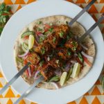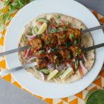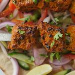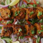 -Marinated meat ko skewers per laga lein.