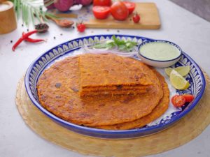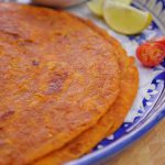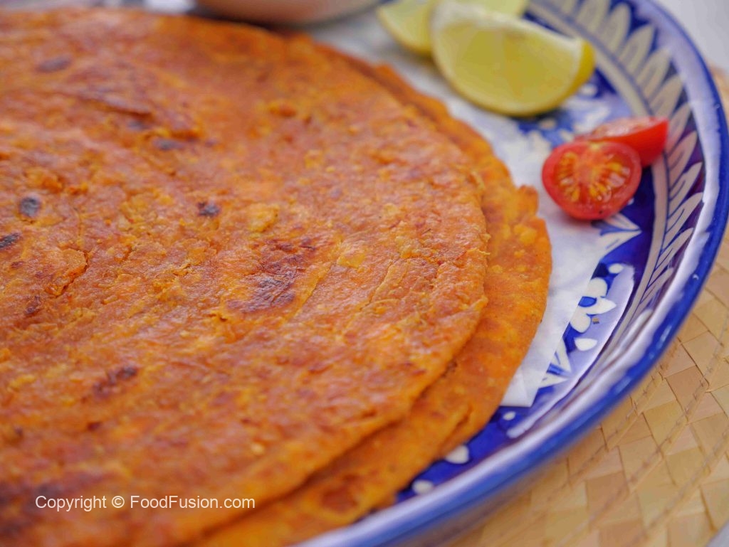 -On a heated griddle, place rolled dough,add desi ghee & fry from both sides until done (makes 5)