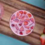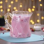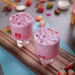 -In a jug,add red jelly cubes,coconut jelly cubes,cooked tapioca sago,srawberry chunks,ice cubes, prepared milk & stir well.