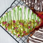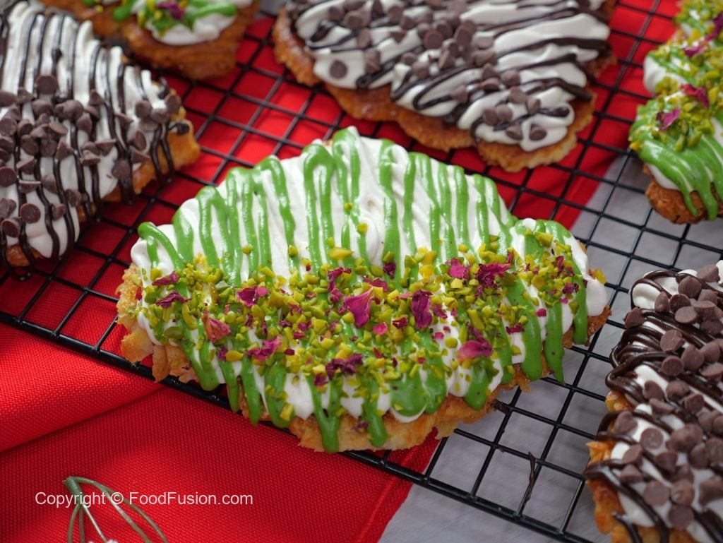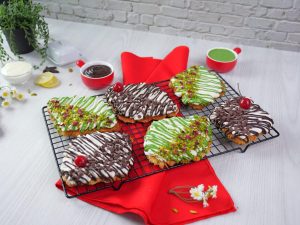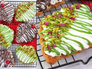 -On a croissant,add & spread cream frosting,pistachio ganache,pistachios & garnish with dry rose petals (makes 6).